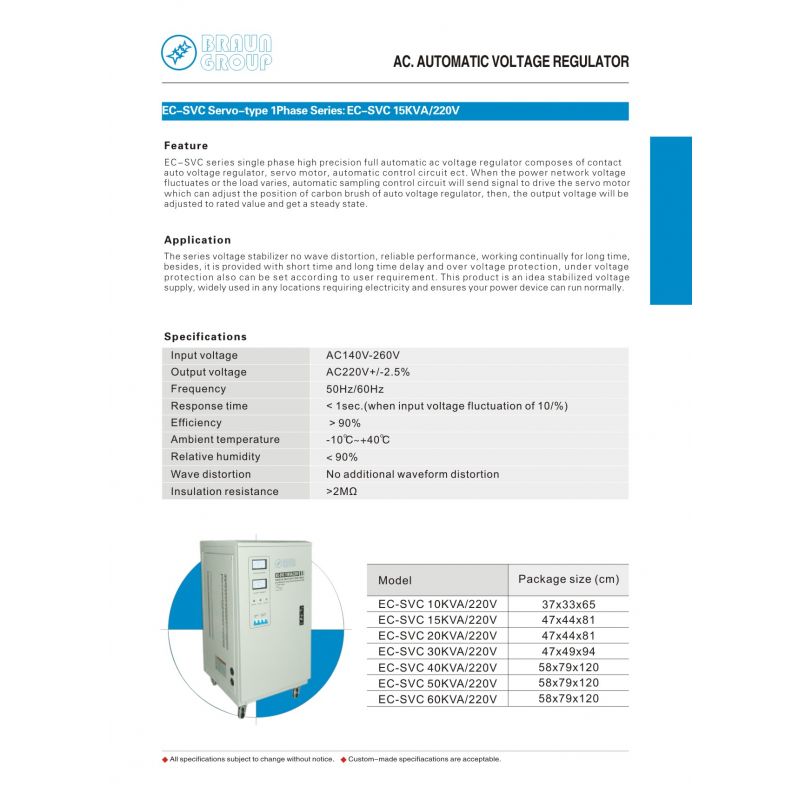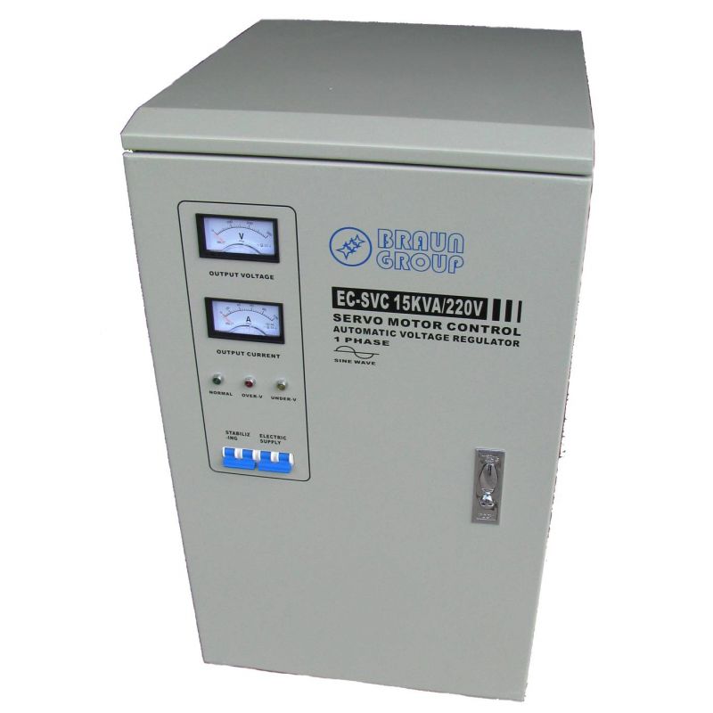Stabilizator de tensiune cu servomotor, putere maxima 15.000VA / 9.000W, Uin: 140VAC-260VAC; Uout: 220VAC, precizie +/-2,5% display analogic tensiune iesire / curent iesire, comutator bypas manual, frecventa de lucru 50/60Hz, timp de raspuns <1,5secunde, umiditate <95%, temperatura de lucru-10+40 grade Celsius, Eficacitate>90%, tip tower cu roti, cu usa frontala cu maner, greutate (inclusiv ambalaj): 59Kg, dimensiuni 52x51x83cm(adancime x latime x inaltime)