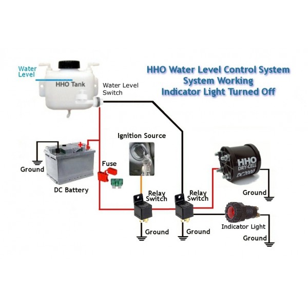În rezervorul de apă vom instala un întrerupător de nivel al apei care va trimite un semnal electric ori de câte ori apa scade sub un anumit nivel. Acest semnal electric va fi conectat la o lumină indicatoare de alarmă și la un releu cu 5 pini care va opri funcționarea sistemului H2. Verificați diagramele ilustrative de mai sus pentru mai multe informații.